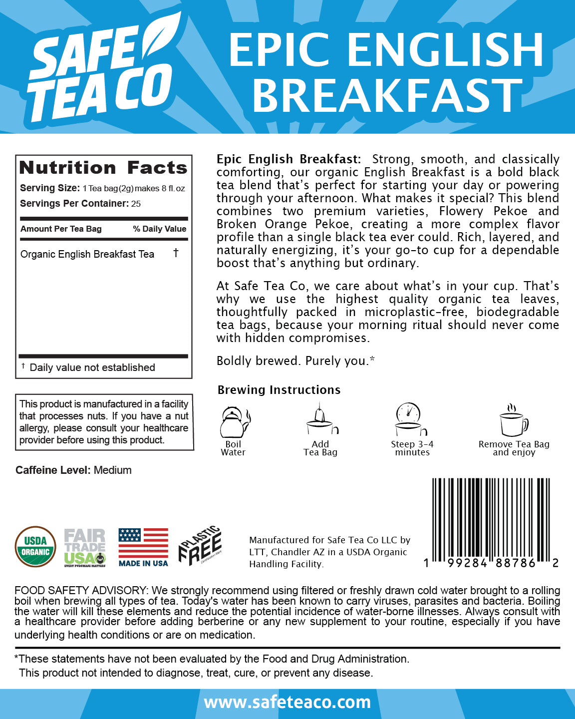 Strong, smooth, and classically comforting, our organic English Breakfast is a bold black tea blend that’s perfect for starting your day or powering through your afternoon. What makes it special? This blend combines two premium varieties, Flowery Pekoe and Broken Orange Pekoe, creating a more complex flavor profile than a single black tea ever could. Rich, layered, and naturally energizing, it’s your go-to cup for a dependable boost that’s anything but ordinary.